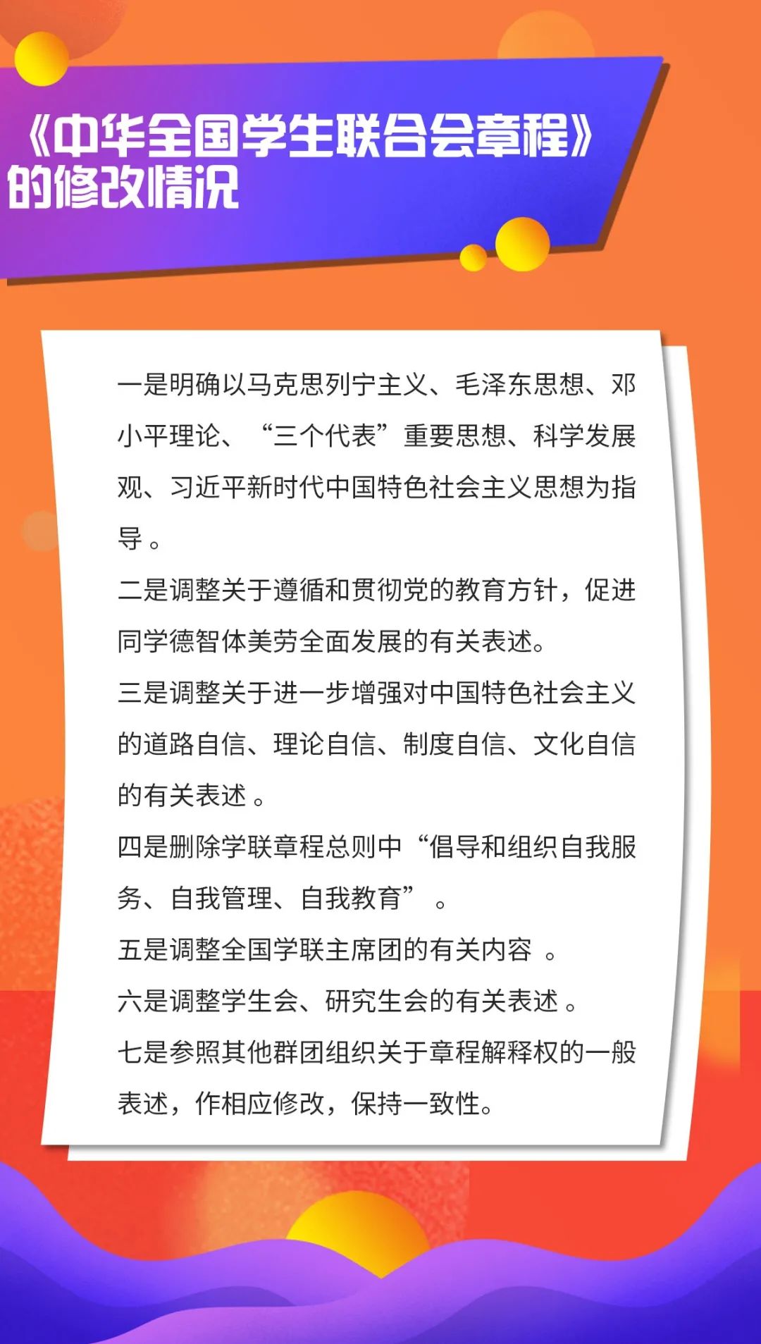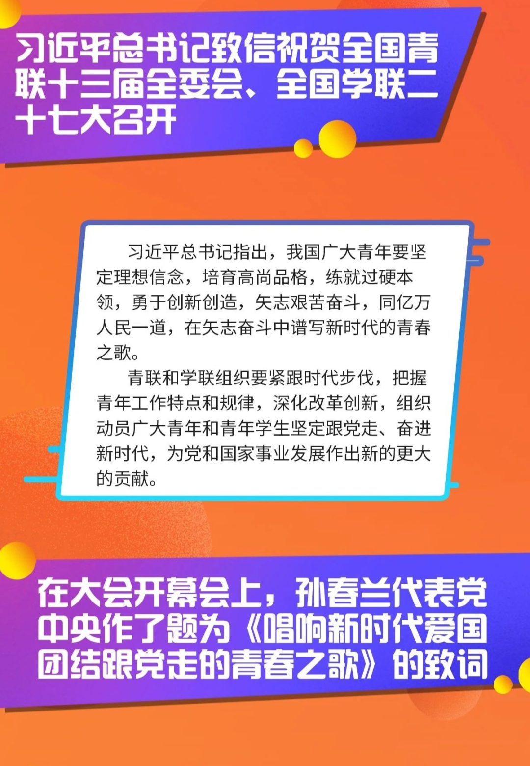 全国青联十三届全委会、全国学联二十七大精神传达学习提纲经党中央批准,中华全国青年联合会第十三届委员会全体会议、中华全国学生联合会第二十七次代表大会(以下简称全国青联十三届全委会、全国学联二十七大)于8月17日至18日召开,取得了圆满成功。全国青联十三届全委会、全国学联二十七大是在党领导全国各族人民即将夺取全面建成小康社会新胜利、开启第二个百年奋斗目标新征程历史交汇之年召开的青春盛会,意义重大、备受关注。两个会议的主要任务是:认真学习贯彻习近平总书记贺信精神和党中央致词精神,全面总结全国青联、全国学联过去五年的工作,对未来五年的工作进行部署,审议有关工作报告,讨论并修改全国青联、全国学联章程,选举产生新一届全国青联、全国学联领导机构。8月17日上午,全国青联十三届全委会、全国学联二十七大开幕。党和国家领导人王沪宁、丁薛祥、孙春兰、杨晓渡、陈希、郭声琨、黄坤明、尤权、艾力更·依明巴海、辜胜阻等出席会议。中共中央政治局委员、中央组织部部长陈希宣读习近平总书记致全国青联十三届全委会和全国学联二十七大的贺信。团中央书记处第一书记贺军科致词。中国科协书记处第一书记怀进鹏代表人民团体致词。中共中央政治局委员、国务院副总理孙春兰代表党中央致词。团中央书记处常务书记、十二届全国青联主席汪鸿雁代表全国青联第十二届常务委员会作了题为《以习近平新时代中国特色社会主义思想为指导 高扬理想主义 厚植家国情怀 坚定推进改革 汇聚实现中华民族伟大复兴中国梦的磅礴青春力量》的报告。二十六届全国学联主席王圣博代表全国学联第二十六届委员会作了题为《勇于自我革命 服务同学成长 在实现中华民族伟大复兴中国梦的进程中书写青春篇章》的报告。8月17日下午至18日上午,全国青联十三届全委会认真学习讨论习近平总书记贺信和党中央致词,审议全国青联第十二届常委会工作报告、中华全国青联联合会章程(修正案)和365体育彩票_365bet体育娱乐场-【官方唯一授权】@:确定中华全国青年联合会会徽的决议,酝酿和提出新一届全国青联主席、副主席、常委选举办法和人选名单。8月18日下午,全国青联十三届全委会举行闭幕会,选举产生了全国青联第十三届委员会主席、副主席和常委共270名,团中央书记处常务书记汪鸿雁当选为全国青联第十三届委员会主席,团中央书记处书记徐晓等18人当选为副主席。会议审议通过了365体育彩票_365bet体育娱乐场-【官方唯一授权】@:《中华全国青联联合会章程(修正案)》的决议和365体育彩票_365bet体育娱乐场-【官方唯一授权】@:确定中华全国青年联合会会徽的决议。闭幕会后,召开了全国青联第十三届一次主席会议和第十三届一次常务委员会会议,审议通过了常委会秘书长、副秘书长名单,审议通过了365体育彩票_365bet体育娱乐场-【官方唯一授权】@:调整界别设置的决议和界别工作委员会主任委员、副主任委员、秘书长名单。会议还审议通过了常委会工作机构设置方案。8月17日下午至17日晚,全国学联二十七大认真学习讨论习近平总书记贺信和党中央致词,审议全国学联第二十六届委员会的工作报告和《中华全国学生联合会章程(修正案)》,选举全国学联第二十七届委员会。8月18日上午,全国学联二十七大举行闭幕会,审议通过了全国学联第二十六届委员会工作报告和全国学联章程修正案。闭幕会后,召开了全国学联第二十七届委员会第一次全体会议,大会选举产生了清华大学学生会、北京大学研究生会等43个会员团体组成的全国学联第二十七届主席团。选举清华大学学生会为全国学联第二十七届主席团体,钱菱潇当选为全国学联主席。会议还审议通过了《365体育彩票_365bet体育娱乐场-【官方唯一授权】@:学联学生会工作人员改进作风服务同学的若干规定》。习近平总书记在贺信中代表党中央,向大会的召开表示热烈的祝贺,向全国各族各界青年和青年学生、向广大海外中华青年致以诚挚的问候。贺信指出,5年来,在党的领导下,在共青团帮助指导下,各级青联和学联组织锐意改革、积极进取,团结广大青年和青年学生在全面建成小康社会进程中贡献智慧力量、展现青春风采,为做好党的青年工作发挥了重要作用。贺信强调,经过全党全国各族人民团结奋斗,我们即将夺取全面建成小康社会伟大胜利,踏上实现第二个百年奋斗目标的新征程。我国广大青年要坚定理想信念,培育高尚品格,练就过硬本领,勇于创新创造,矢志艰苦奋斗,同亿万人民一道,在矢志奋斗中谱写新时代的青春之歌。贺信指出,青联和学联工作是党的青年工作的重要组成部分。各级党委和政府要加强对青年工作的领导,关心和支持青联和学联工作,为广大青年和青年学生增长才干、施展才华创造良好条件。贺信强调,青联和学联组织要紧跟时代步伐,把握青年工作特点和规律,深化改革创新,组织动员广大青年和青年学生坚定跟党走、奋进新时代,为党和国家事业发展作出新的更大的贡献。在大会开幕会上,孙春兰代表党中央作了题为《唱响新时代爱国团结跟党走的青春之歌》的致词。致词首先向大会的召开表示热烈的祝贺,向全国各族青年、大中学生和留学生、港澳台青年同胞、海外青年侨胞,表示亲切的问候和良好的祝愿。致词
